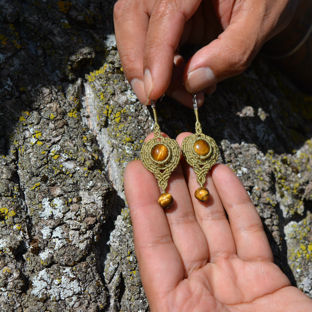 Belle boucle d’oreille couleur beige foncé avec de petit paillet doré, pierre principale œil de tigre, accompagné de une perla de œil de tigre, tige en argent 9.25, taille 6cm sans le tige