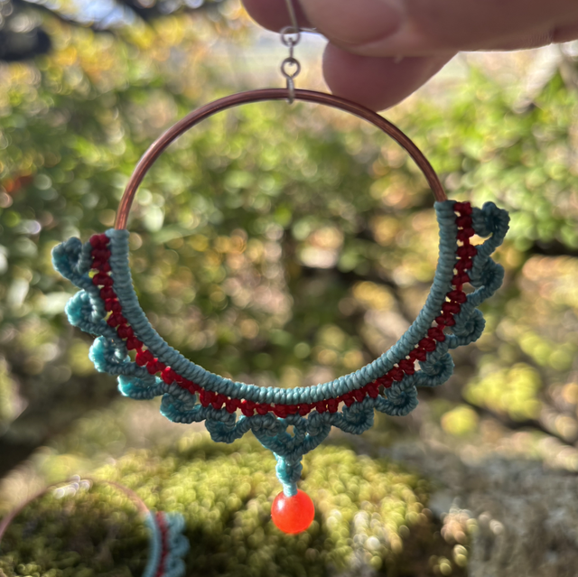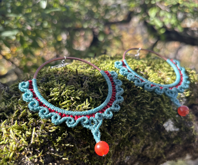 Boucle d’oreille en micro macramé, couleur turquoise et rouge, créole en cuivre, perla cornaline, tige en argent 9.25, taille sans le tige 8 cm