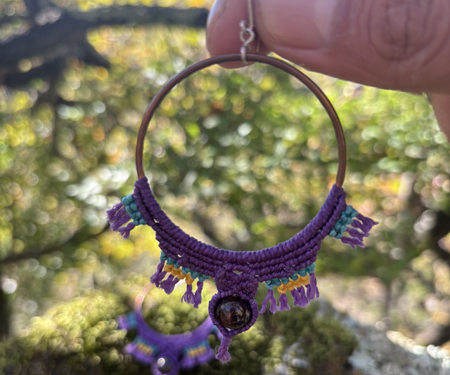 Boucle d’oreille en micro macramé couleur violet, turquoise et jaune. Perla grenat, créole en cuivre, tige en argent 9.52, taille sans le tige 8 cm
