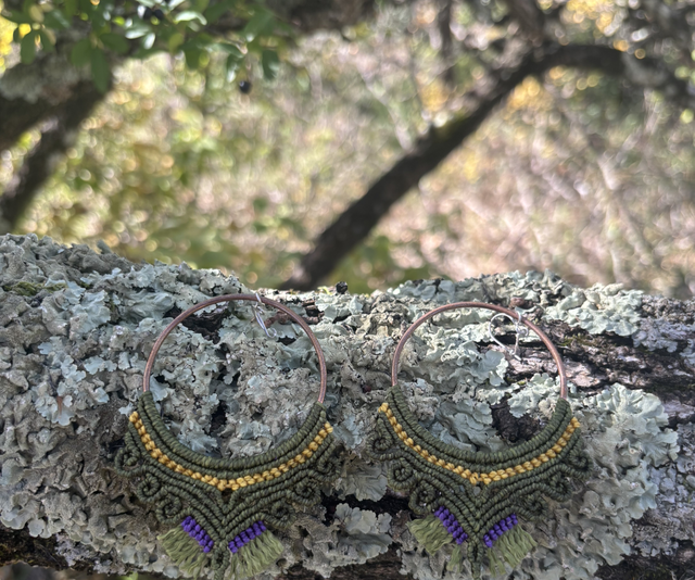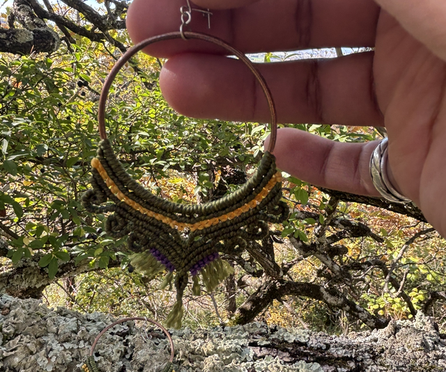 Boucle d’oreille en micro macramé, couleur verte foncée, violet et jaune. Taille sans le tige 8.5 cm. Créole en cuivre et tige en argent 9.25